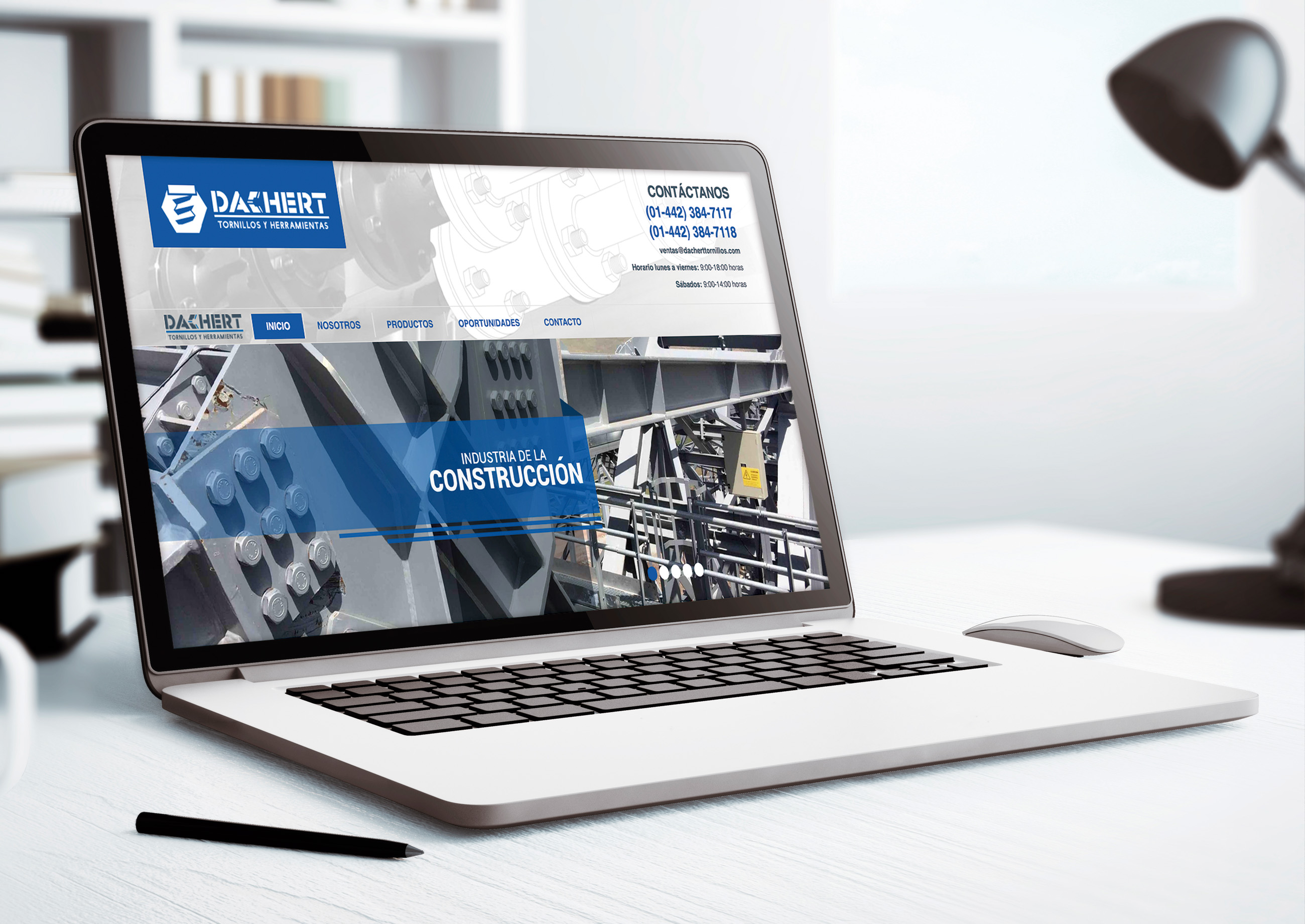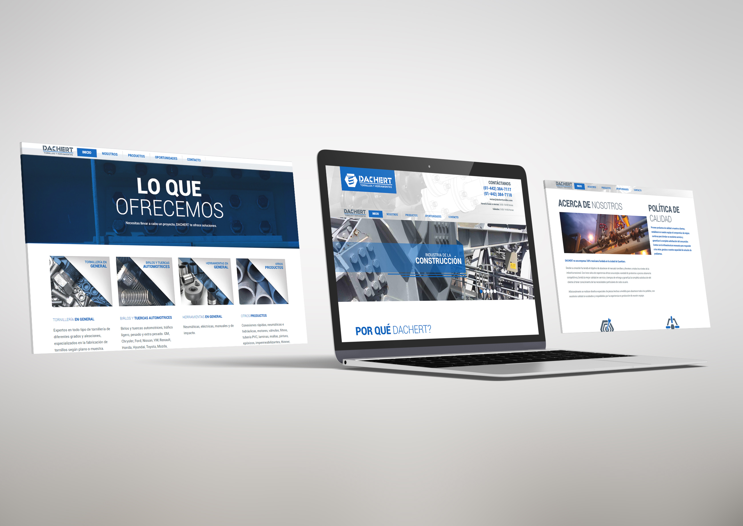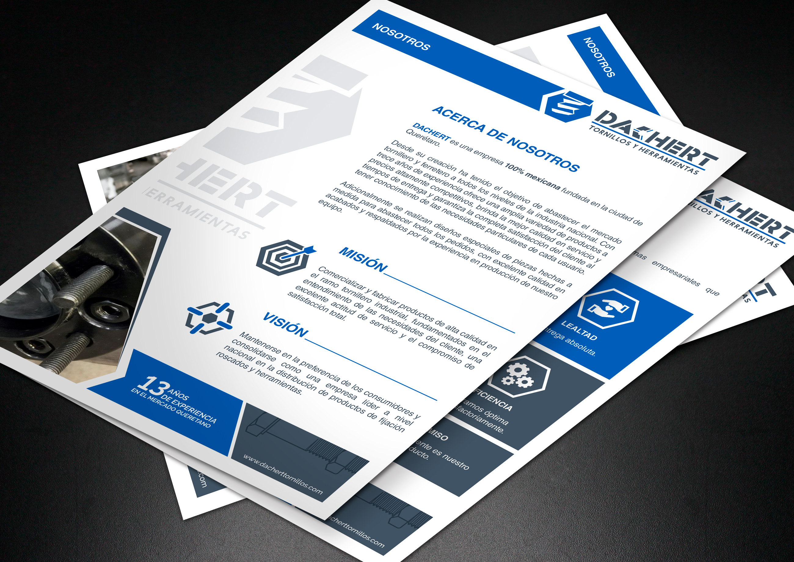 Para Dachert diseñamos el logotipo de la empresa, así como su página Web, elaboramos una carta presentación que muestra sus principales productos y servicios y se diseñaron tarjetas de presentación.